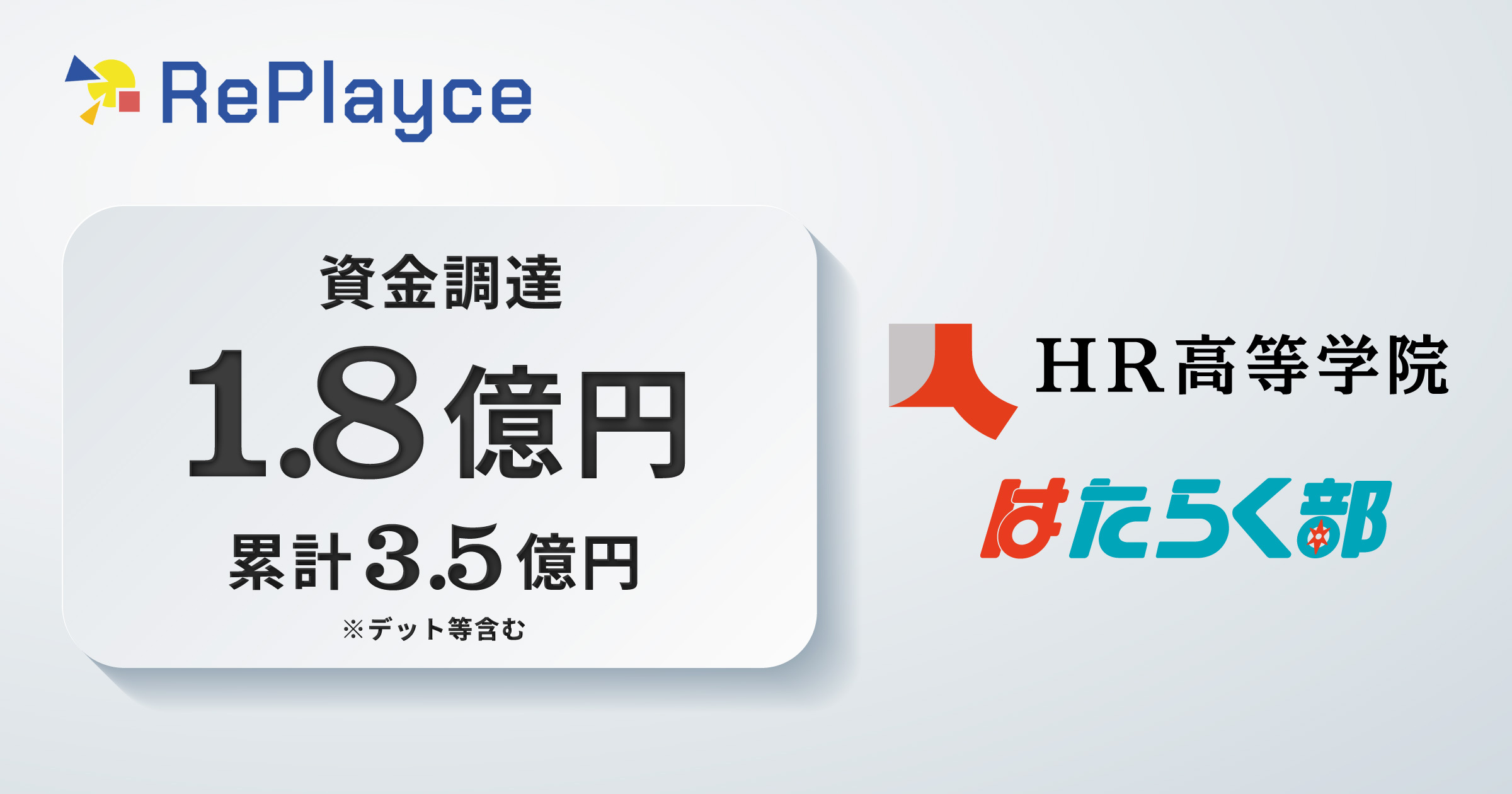 中高生向けキャリア探究サービス「はたらく部」や通信制高校サポート校「HR高等学院」を運営する株式会社RePlayce(本社:東京都渋谷区、代表取締役CEO:山本将裕、以下RePlayce)は、株式会社ジェネシア・ベンチャーズ、ニッセイ・キャピタル株式会社、株式会社オリエンタルランド・イノベーションズ、株式会社NTTドコモ、株式会社アルファドライブを引受先とする総額1.8億円の第三者割当増資による資金調達を実施したことをお知らせいたします。本調達により、RePlayceの累計調達額は3.5億円となります。