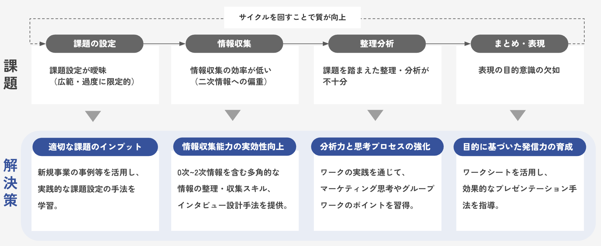 質の高い探究活動を実現するためには、適切な課題設定や仮説思考を起点とし、分析のロジック向上、明確な目的意識に基づく表現へと導く体系的な指導プロセスが不可欠です。