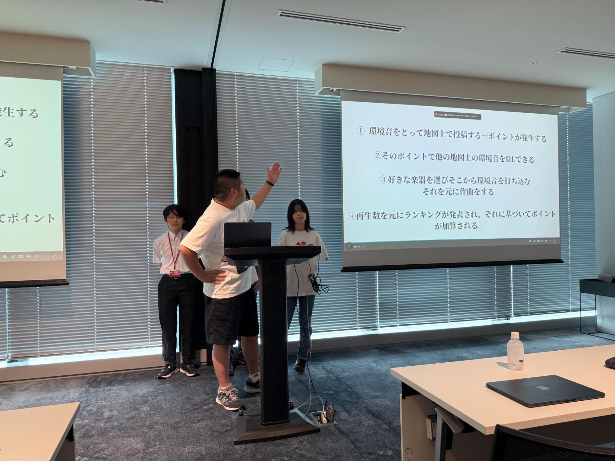 日常の環境音や何気ない音を録音し素材として扱い、自分だけの音楽を生成できるサービスのプレゼンを行いました。